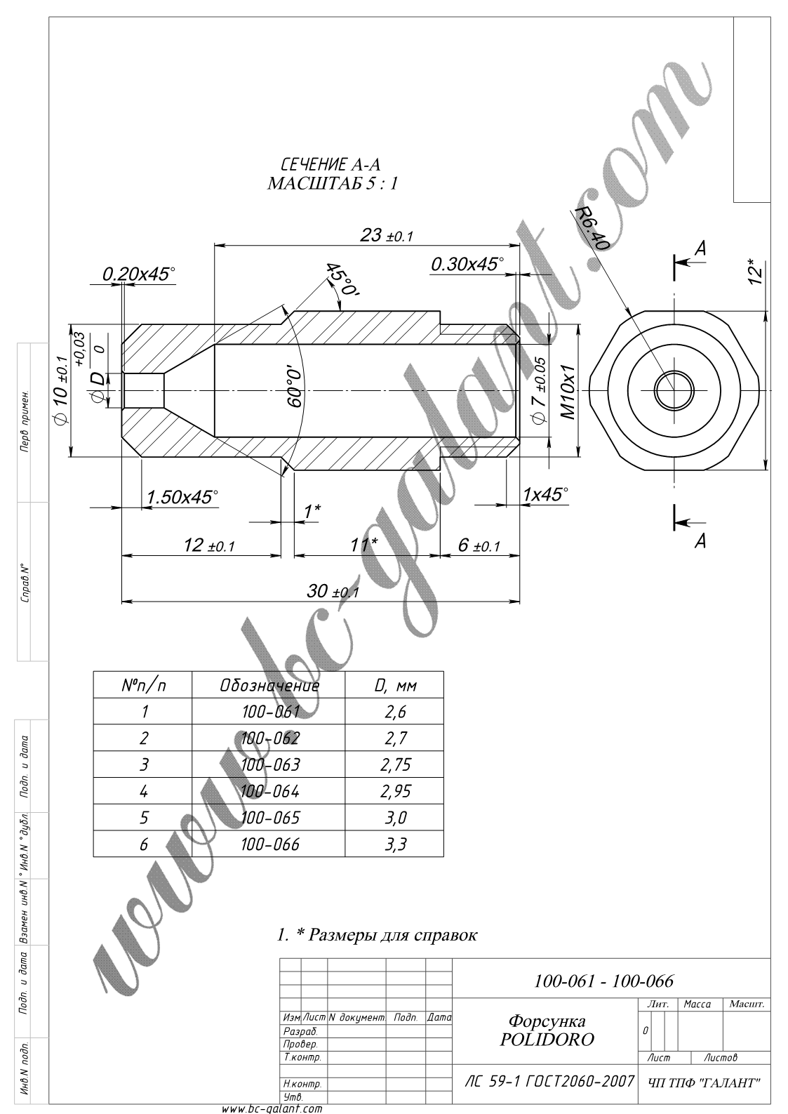 Форсунки изготавливаются из латуни ЛС – 59 и имеют крепёжную резьбу М10х1.
