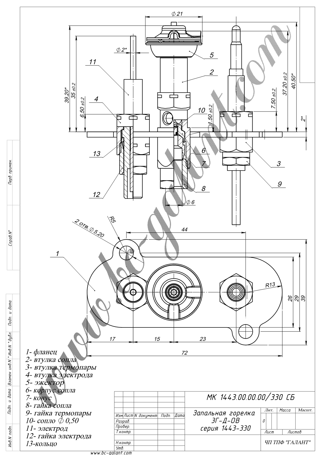 У зборі, 2 факели, без електрода розпалювання, інжектор 0,50мм (100-002), приєднання газу 6мм, має отвір для приєднання термопари.